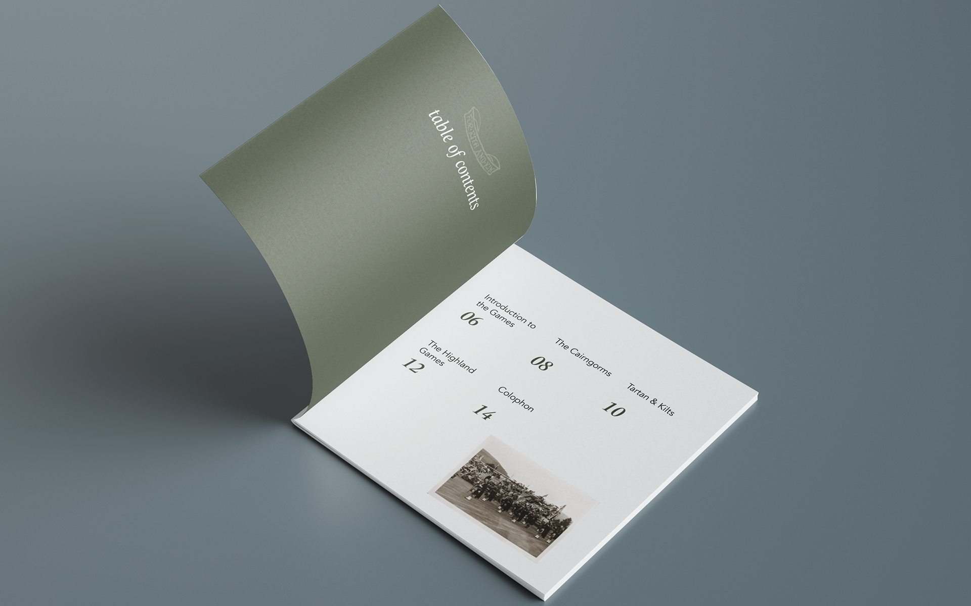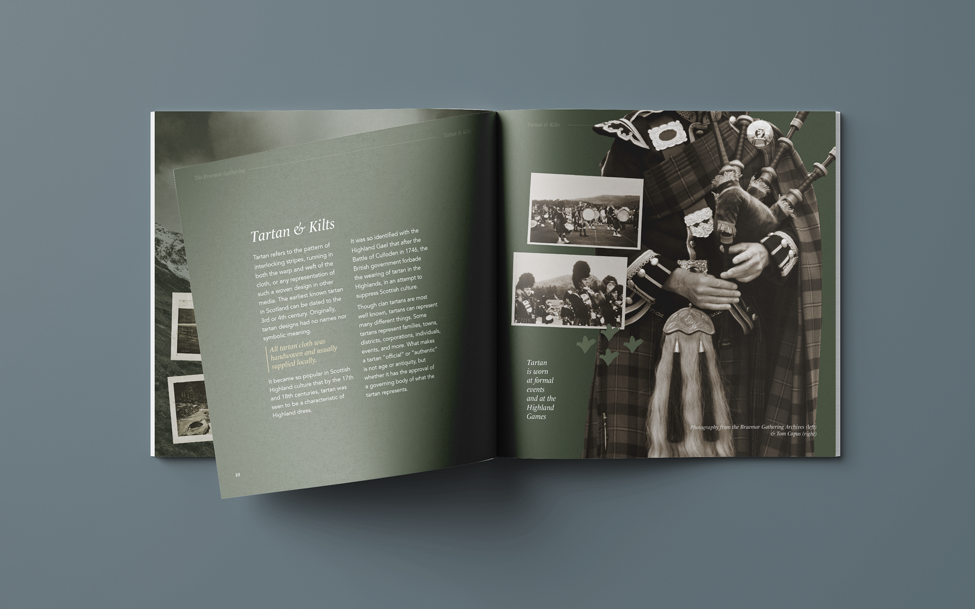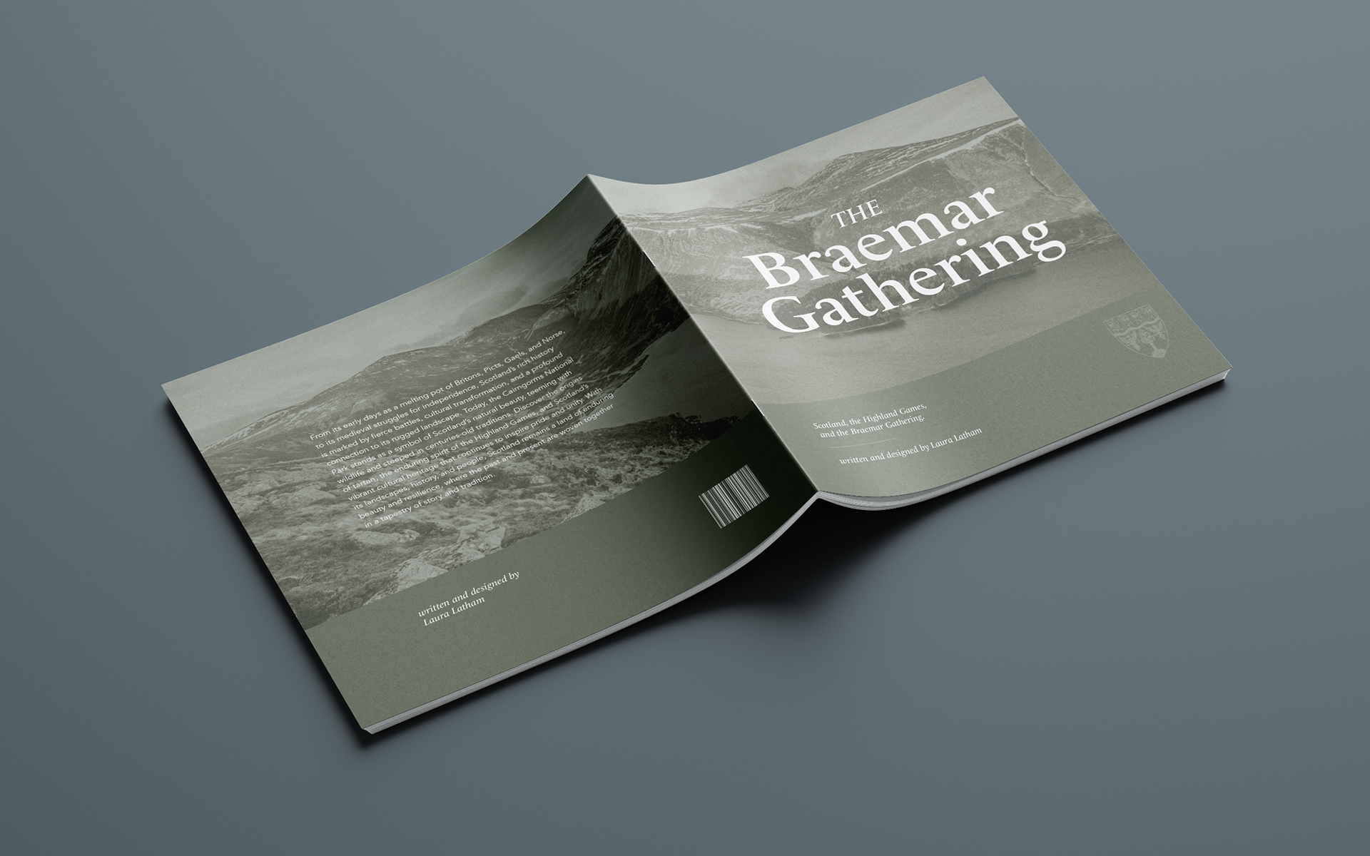 The Braemar Gathering: Scotland, the Highland Games, and the Braemar Gathering is a cultural book focusing on the rich Scottish culture surrounding the Cairngorms and Braemar area, traditional tartan pattern and kilts, and the Highland games. This book is the culmination of my ADS 341 course, where we focused on editorial design. A goal of mine for this project was to push myself out of my usual aesthetic by using Adobe Photoshop to edit photography and create collages using ephemera of the Braemar Gathering from the games' official archive.