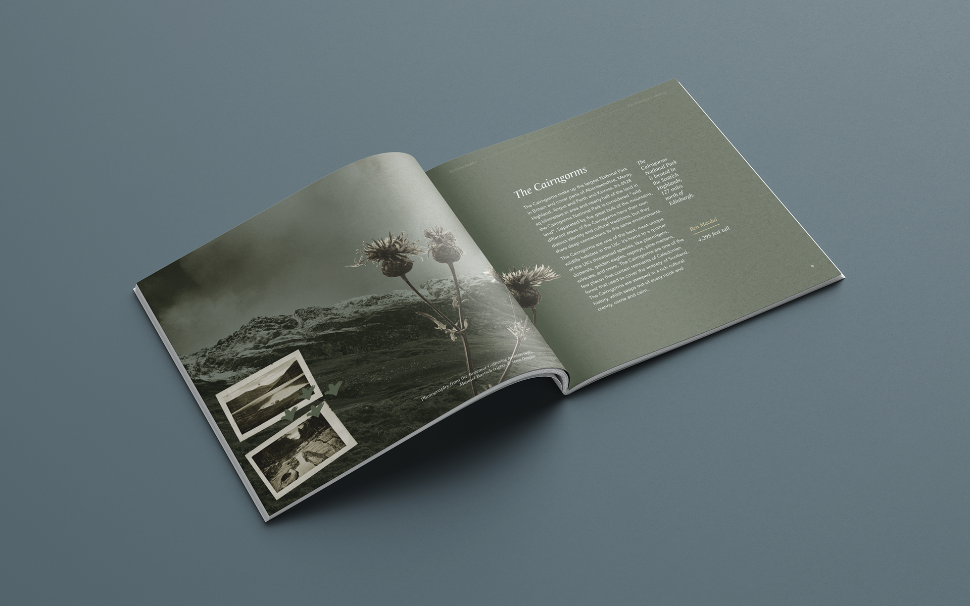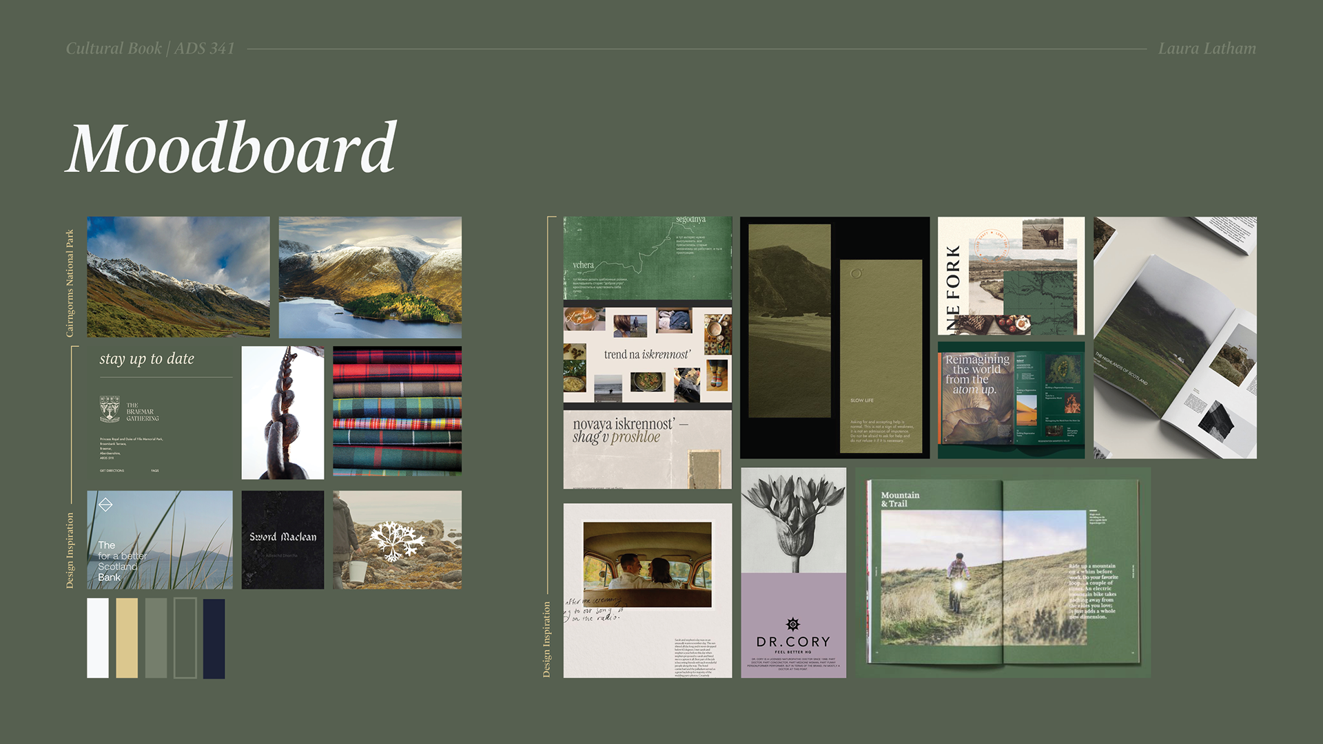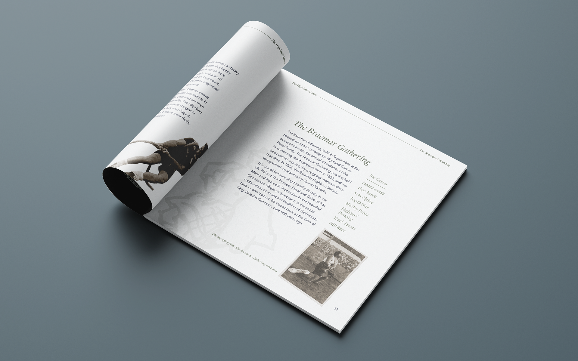The Braemar Gathering: Scotland, the Highland Games, and the Braemar Gathering is a cultural book focusing on the rich Scottish culture surrounding the Cairngorms and Braemar area, traditional tartan pattern and kilts, and the Highland games. This book is the culmination of my ADS 341 course, where we focused on editorial design. A goal of mine for this project was to push myself out of my usual aesthetic by using Adobe Photoshop to edit photography and create collages using ephemera of the Braemar Gathering from the games' official archive.